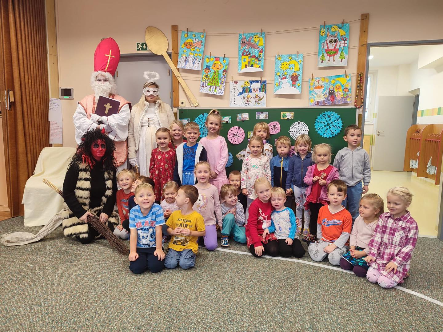 Už za svého života byl velmi oblíbený mezi lidmi, proslul štědrostí k potřebným, jako obránce víry a zachránce nespravedlivě obviněných. A dnes přišel rozdat dobrůtky i k nám:) Slyšel spousty krásných písniček a básniček. Čertík postrašil trošku zlobílky a andílek čerta hlídal a pak zlobílky uchlácholil.